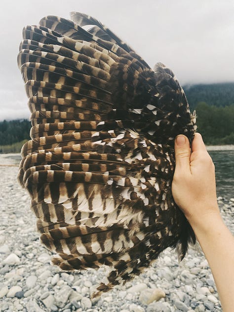 I’m laying on a sheepskin, near the stone cairn where I buried the owl. I still smell the musk of their wings as the crisp, fall air rushed through them, feathers dancing above me as I held them to the sky like a prayer and I felt their spirit rest on my shoulder. Stone by stone I buried their body in a cairn grave at the fork of a river, a crossroads - a place fitting for Ereshkigal's messenger, the myth of her descent playing through the speakers in my truck when I found the Owl’s body lying smack in the center of the road. I gathered water from the river, cupped hands dripping as I walked to pour the water over the grave in offering.